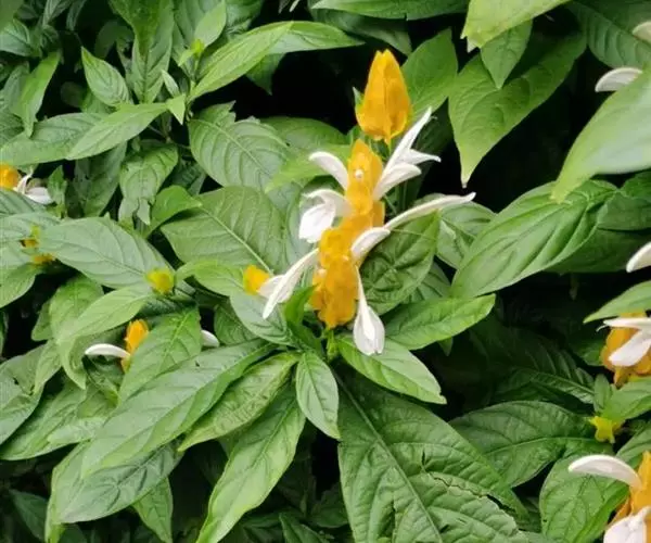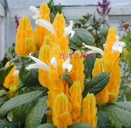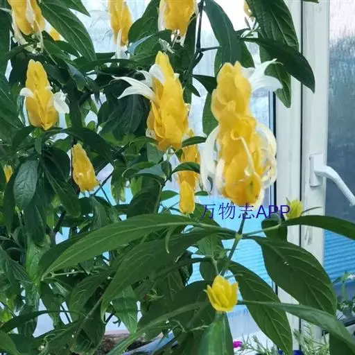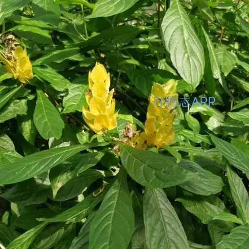 常绿灌木,高达1米,多分枝。叶对生,狭卵形,长达12厘米,亮绿色,叶面皱褶有光泽。穗状花序顶生,长达10-15厘米,直立:苞片心形、金黄色,排列紧密,花白色,唇形,长约5厘米,从花序基部陆续向上绽开,金黄色苞片可保持2-3个月。 金苞花
