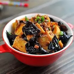 辣白菜300克、豆腐1块、广东香肠1根、虾米(油炸)1大勺、香菇5朵、木耳(水发)8朵、大白菜(叶)3片、生抽数滴、番茄酱1小勺、植物油15克、水适量。