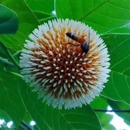 花序顶生,密集成球状,总梗长1厘米或稍短;苞片叶状,卵形或披针形,长1-2厘米,渐尖,边缘全缘或有少数粗齿,有条纹状脉纹,被柔毛;萼管球状至倒圆锥状,长1.8-2毫米,裂片钻形,长8-9毫米,锐尖;花冠黄色,管状,长约1.3厘米,外面近无毛,内面被长柔毛,裂片近三角形,长1.8-2毫米,反折;雄蕊5,长柱花的着生冠管近基部,内藏,短柱花的生喉部,稍伸出;花柱深2裂,长柱花的稍伸出,短柱花的内藏。