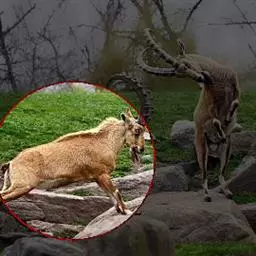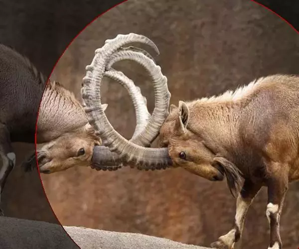 在长角的动物中北山羊的雄羊争偶打斗是最激烈的:“情敌”相见分外眼红,将两只前蹄抬起悬在胸前,偏着头,将角用力向着对方撞击过去。双方的角相持不下,据说力量可以达到4吨。角上的棱可以防止滑动而避免误伤对手。