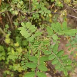 直立灌木,高40-100厘米。茎褐色,圆柱形,有皮孔,枝银灰色,被灰白色丁字毛。羽状复叶长2.5-5厘米;叶柄长达1厘米,叶轴上面有槽,与叶柄均被灰色平贴丁字毛;托叶三角形,长约1毫米,早落;小叶2-4对,对生,椭圆形,稍倒阔卵形,长5-1.5毫米,宽3-10毫米,先端钝圆,基部圆形,上面绿色,疏被丁字毛,下面苍绿色,丁字毛较粗;小叶柄长0.5毫米;小托叶与小叶柄近等长或不明显。
