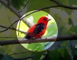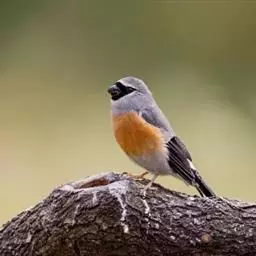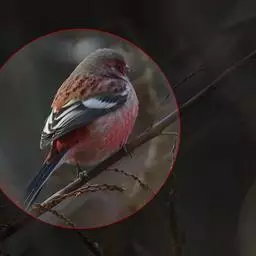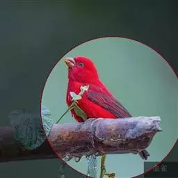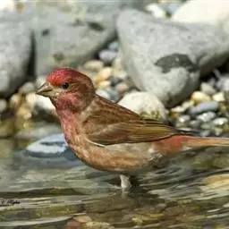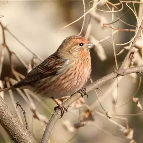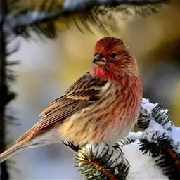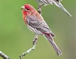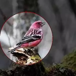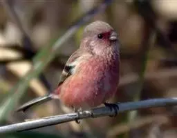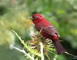 红腰朱雀:体长12-14厘米,小型鸟类。雄鸟前额和眉纹玫瑰粉红色,头顶和一宽的贯眼带深红褐色,背红…