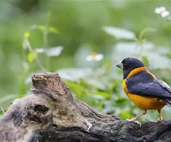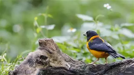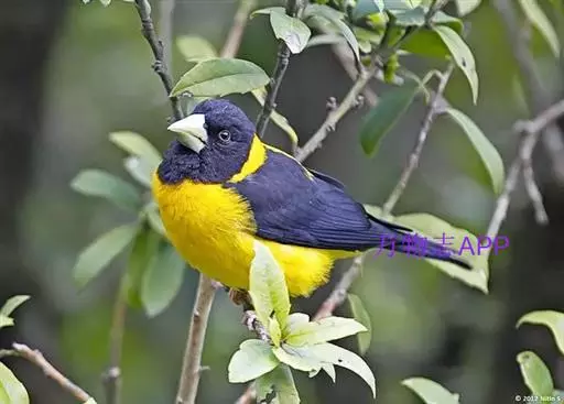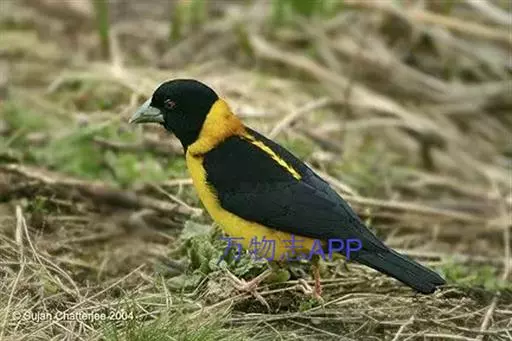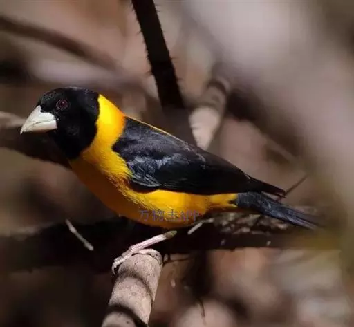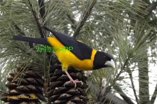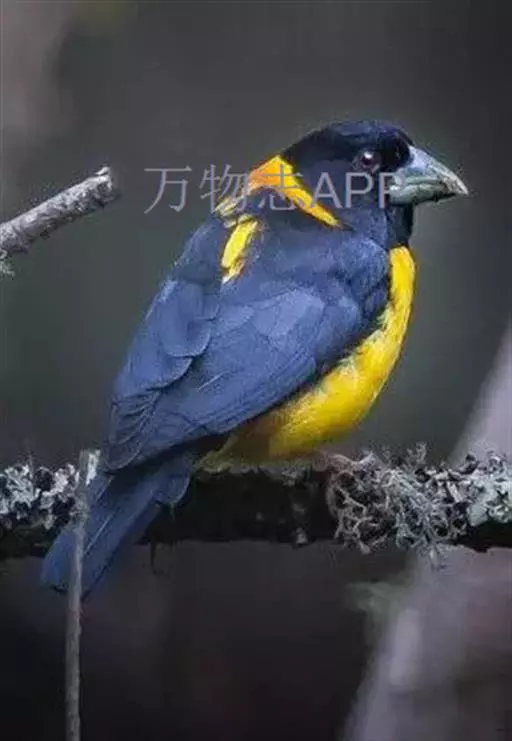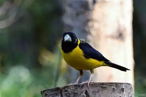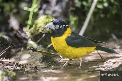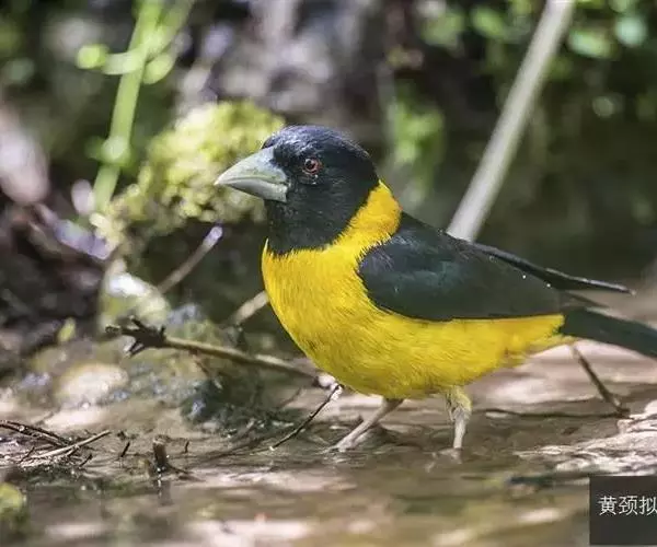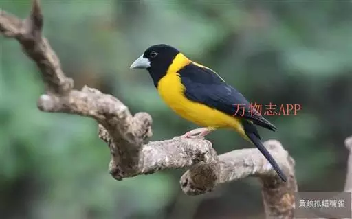 黄颈拟蜡嘴雀(学名:Mycerobas affinis):小型鸟类,体长20-22厘米。嘴粗大,黑色。雄鸟整个头、颈、颏、喉和上胸辉黑色,两翅和尾亦为黑色,其余上体橙黄色,下体鲜黄色。雌鸟头、颈、颏、喉和上胸中央灰色或暗灰色,背、肩和两侧覆羽橄榄绿色,腰黄色,两翅和尾黑色,下体橄榄黄色。