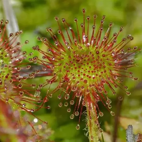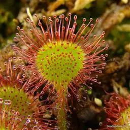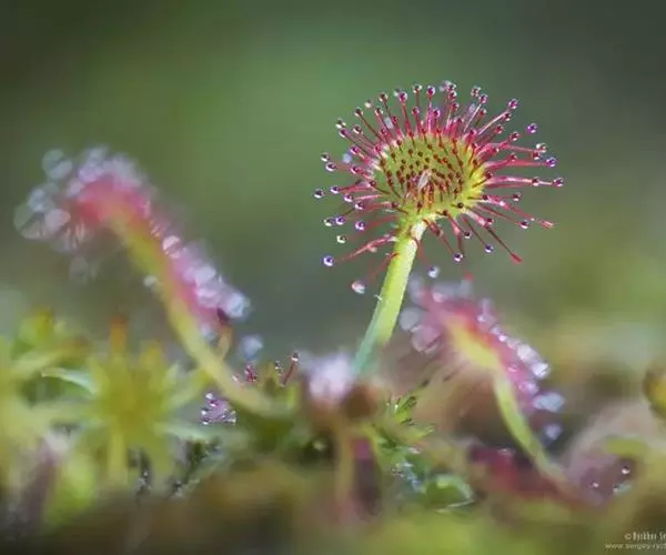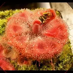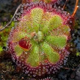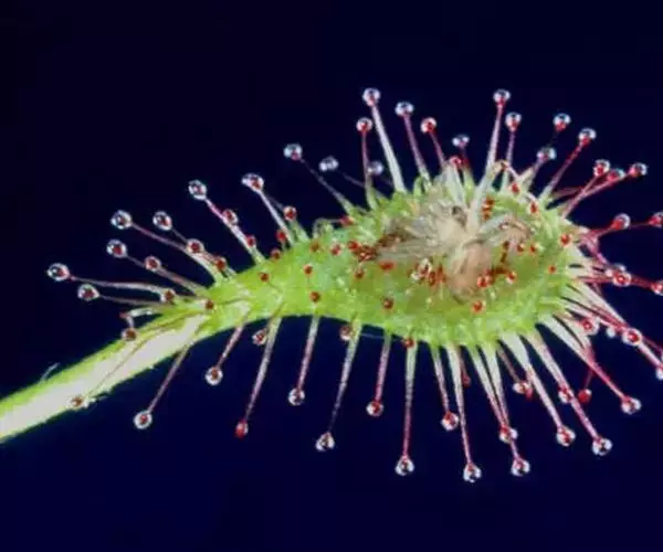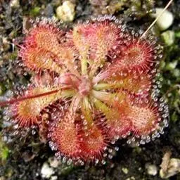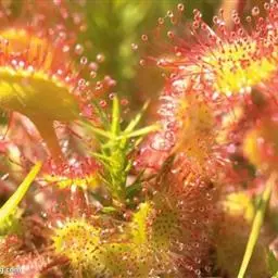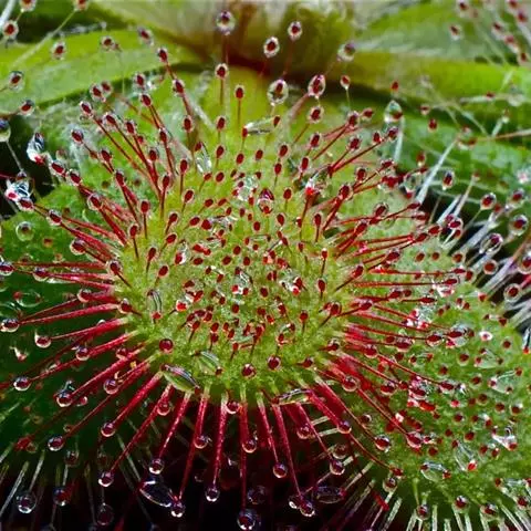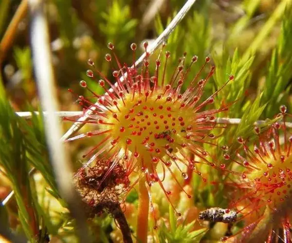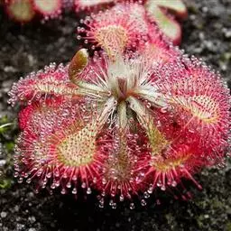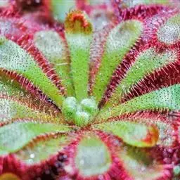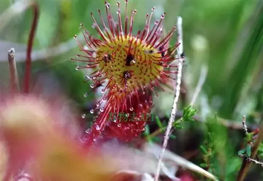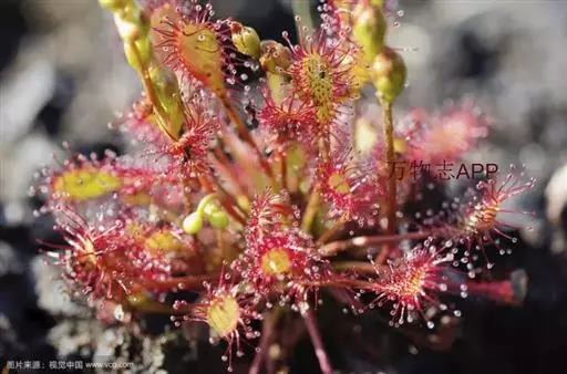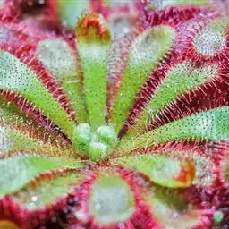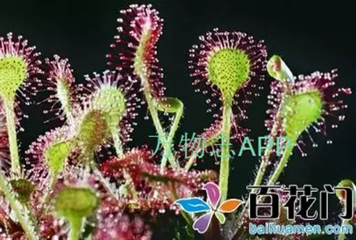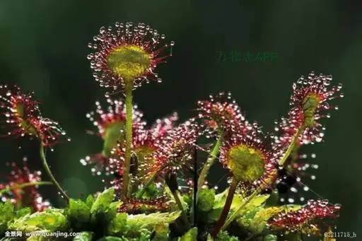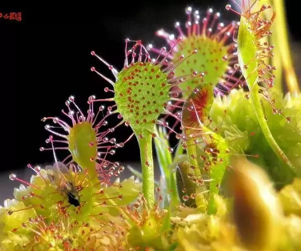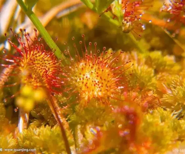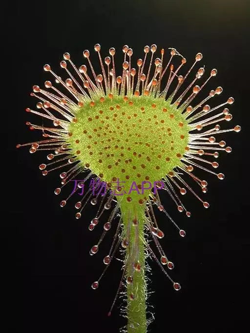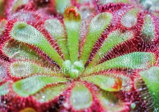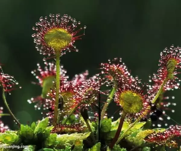 茅膏菜的叶上长着象露珠一样晶莹剔透的腺毛,这就是她们的捕虫器。就在腺毛的顶端有一个球状体,时常呈现出鲜艳的色彩,大多为红色,上面布满腺体,能分泌吸引昆虫的蜜汁与粘液的混合物和消化酶,外表就象是嵌有红宝石的水晶,如此的精美都无法想象这就是昆虫的死亡陷阱。当挡不住诱惑的昆虫来采食时,却发现自己已被粘住,恐慌中竭力的挣扎,结果周围的腺毛一起弯过来,有时叶片也会随之卷起,粘的更牢了。无法逃脱的昆虫被这些腺毛消化吸收,等消化吸收完全后,叶片和腺毛又重新展开,等待新的猎物。