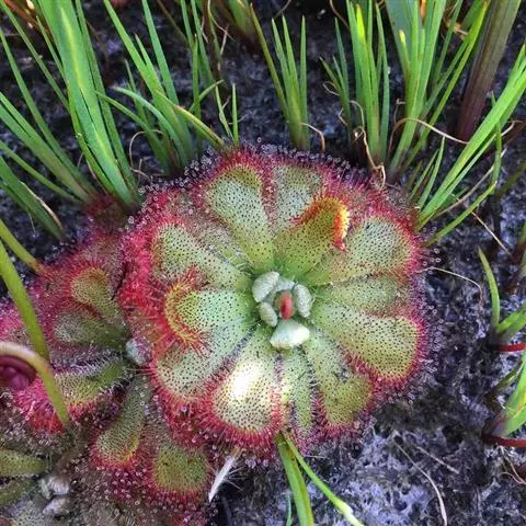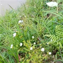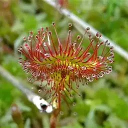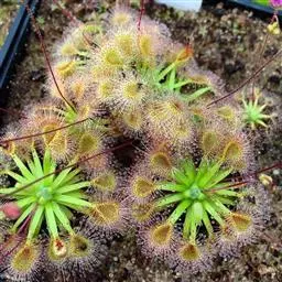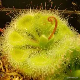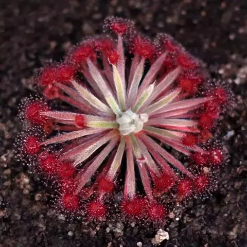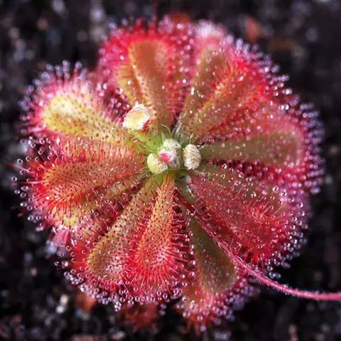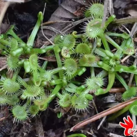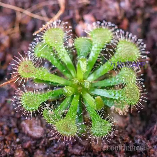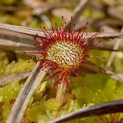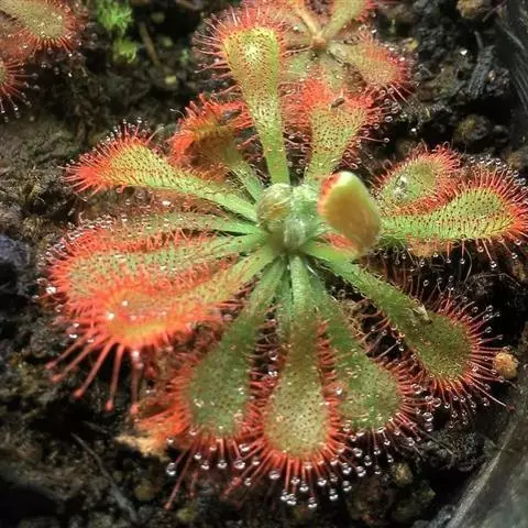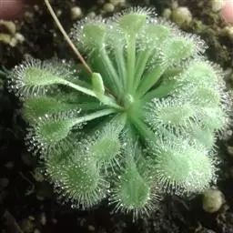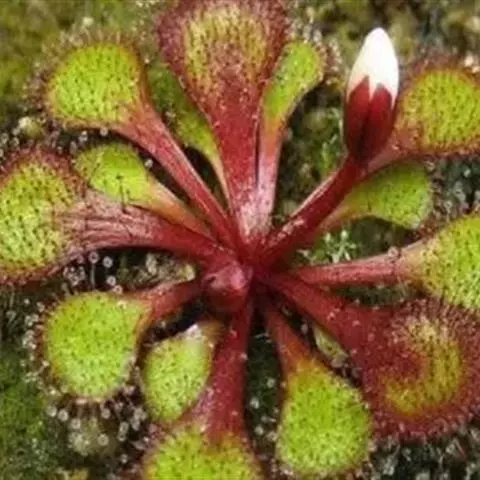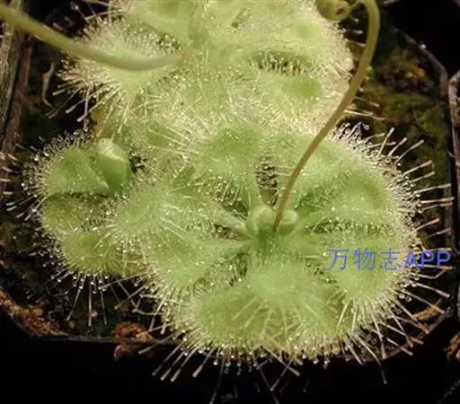 迷你茅膏菜学名圆叶茅膏菜(Drosera rotundifolia L.),又名毛毛苔、迷你毛毡苔和迷你茅膏菜,茅膏菜科植物。多年生草本,茎短,叶基生,叶片圆形或扁圆形,螺状聚伞花序1-2条,腋生,花葶状,纤细,直立,蒴果,熟后开裂为3果爿,种子多数,椭圆球形,花期夏、秋季,果期秋、冬季。茅膏菜不能适应寒冷或暴晒等自然环境,对恶劣的环境没有很强的抵御能力,寒冷与炎热地带不适宜生存。圆叶茅膏菜产于我国吉林和黑龙江,欧洲中部和北部、亚洲和美洲北部等寒冷地带也有分布,常生于海拔900-1000米的山地湿草丛中。圆叶茅膏菜全草可作支气管炎祛痰药。