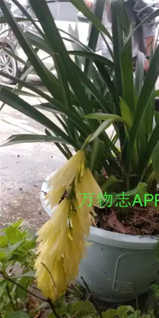 附生草本;假鳞茎近卵形,长4-9厘米,宽2-3厘米,包藏于叶基之内。叶6-13枚,二列,带形,长45-80厘米,宽1-1.7厘米,先渐尖或钝,通常略2裂,关节位于距基部4-10厘米处。花葶从假鳞茎下部叶腋内长出,通常长40-50厘米,下弯;总状花序下垂,具20余朵花;花苞片小,长2-3毫米;花梗和子房长1.2-2.1厘米;花下垂,狭钟形,几不开放,稍有香气,奶油黄色至淡黄绿色,有时略有淡粉红色晕或唇瓣上偶见少数红斑点,褶片亮橙黄色;萼片狭倒卵状披针形,长3.4-4.3厘米,宽7-9毫米;花瓣宽线状倒披针形,长3-4厘米,宽5-6毫米;唇瓣倒披针状三角形,长3-4厘米,3裂,基部与蕊柱合生约2-3毫米;侧裂片多少围抱蕊柱,常具很小的乳突,边缘无缘毛;中裂片较小,长8-10毫米,宽5-6毫米,中央有1个密生短毛的斑块,边缘稍波状;唇盘上的2条纵褶片从基部延伸至中裂片基部,在近末端处汇合并具短毛,在基部增粗并在两褶片间形成槽状凹陷;蕊柱长2.8-3.2厘米,腹面下部疏生微毛;花粉团2个,近棒状。蒴果椭圆形,长2-2.5厘米,宽1.5-2厘米。花期10-12月。