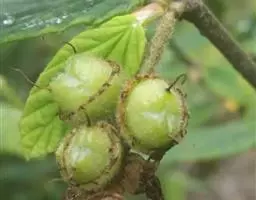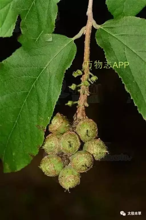 牛鼻栓又名连合子、木里仙。落叶小乔木或灌木,高2-5m。嫩枝有灰褐色柔毛;老枝有稀疏皮孔。单叶互生;叶柄长4-10mm;托叶早落;叶片膜质,倒卵形或倒卵状椭圆形,长5-16cm,宽3-9cm,先端渐尖,基部圆形或钝,稍偏斜,缘具波状锯齿;叶脉深入齿端小尖头,沿主脉和下面有星状毛。花杂性,两性花和雄花同长于一植株上;雄花序呈短葇荑状,有发育不全的雌蕊;两性花的花序长3-6cm;苞片及小苞片披针形,有星状毛;萼筒长1mm,无毛,萼齿5,卵形,长1.5mm,先端有毛;花瓣5,钻形,较萼片稍短;雄蕊5,花药卵形,长约1mm;子房半下位,2室,花柱2,向外卷曲。蒴果木质,卵圆形,长1.5cm,有白色皮孔,沿室间2片开裂,每片2浅裂。种子卵圆形,长约1cm,暗棕色,有光泽。花期4-5月,果期7-8月。