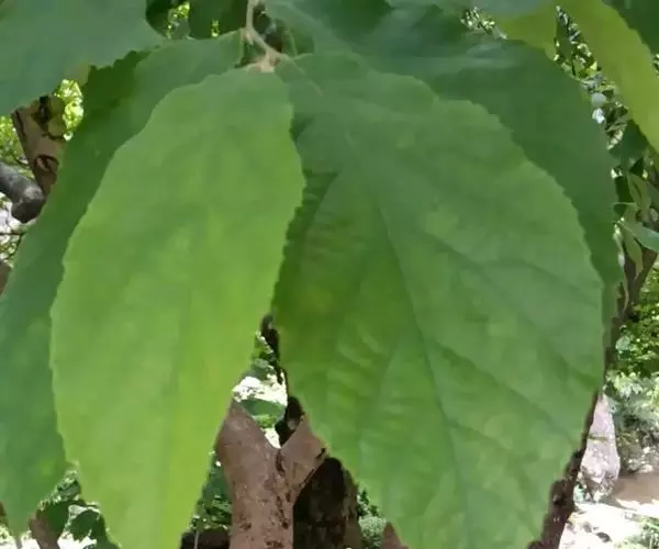 茎枝圆柱形,长短及粗细不一,表面褐色或灰褐色,有稀疏的圆形皮孔,小枝密生星状毛。叶多皱缩,完整叶片展平后倒卵状椭圆形,基部稍偏斜,长6-16cm,宽3-9cm,叶片下面、叶脉及叶柄均有星状毛,边缘有锯齿。气微,味微苦、涩。