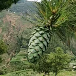 球果卵圆形或圆锥状卵圆形,长4-7厘米,径2.5-4厘米,有短梗,下垂,成熟前绿色,熟时栗褐色,陆续脱落;中部种鳞近矩圆状倒卵形,或近长方形,长约3厘米;鳞盾菱形,微隆起或平,横脊微明显,鳞脐微凹,无刺,生于干燥环境者常具极短的刺;种子长卵圆形,长4-6毫米,连翅长2-2.7厘米;子叶5-8枚;长1.2-2.4厘米;初生叶条形,长2.5-3.6厘米,叶缘具疏生刺毛状锯齿。花期4-5月,球果第二年10-12月成熟。