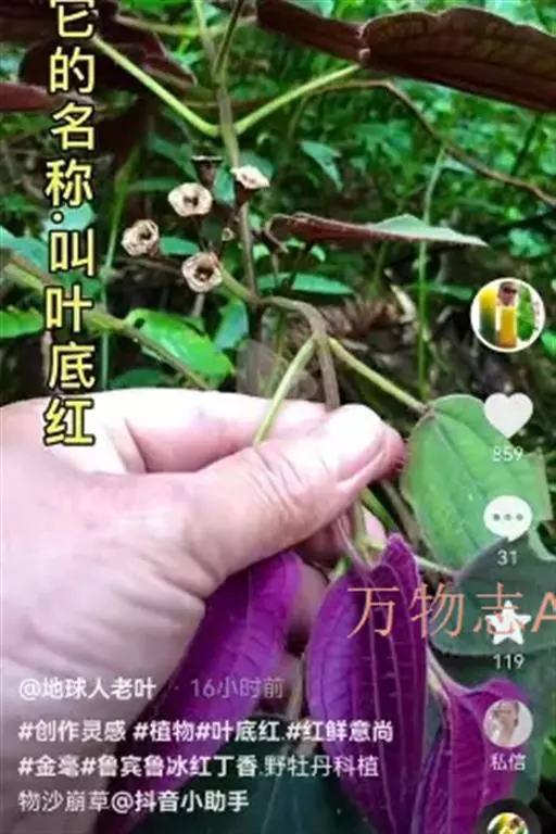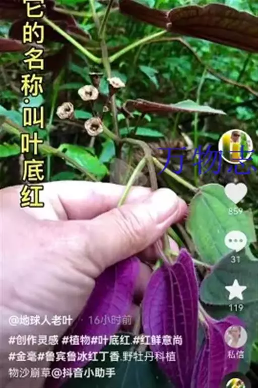 叶底红(原变种)叶下红(浙江),江南野海棠、大毛蛇,血还魂,还魂红、沙崩草(广西),假紫苏(广东),野海棠(中国高等植物图鉴)图版43:1-5