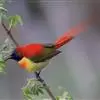 火尾太阳鸟(学名:Aethopyga ignicauda)为太阳鸟科太阳鸟属的鸟类。体长20厘米,色彩艳丽。雄鸟红色,具形长的艳猩红色中央尾羽。头顶金属蓝色,眼先和头侧黑色,喉及髭纹金属紫色。下体黄色,胸具艳丽的橘黄色块斑。雌鸟灰橄榄色,腰黄,体型比雄鸟小许多。虹膜褐色;嘴黑色;脚黑色。叫声为轻声颤音shweet。鸣声为单调的dzidzi-dzidzidzidzi声。