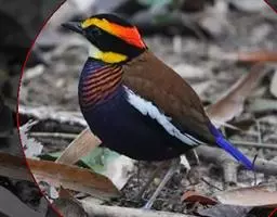 雄鸟前额,头顶辉蓝色,并由两侧向下延伸至整个颏、喉亦为辉蓝色,耳以后头顶两侧、枕、后颈、颈侧、背、肩和尾上覆羽概为火红色。中央一对尾羽概为火色,外侧尾羽外翈火红色,内翈褐色。腰亮红色,两翅褐色,飞羽羽缘橄榄黄色。眼先、颊、耳羽黑色,胸鲜黄色,胸中部缀有桔红色,腹和尾下覆羽淡黄沾绿色。