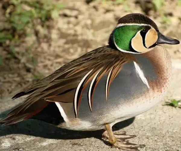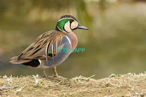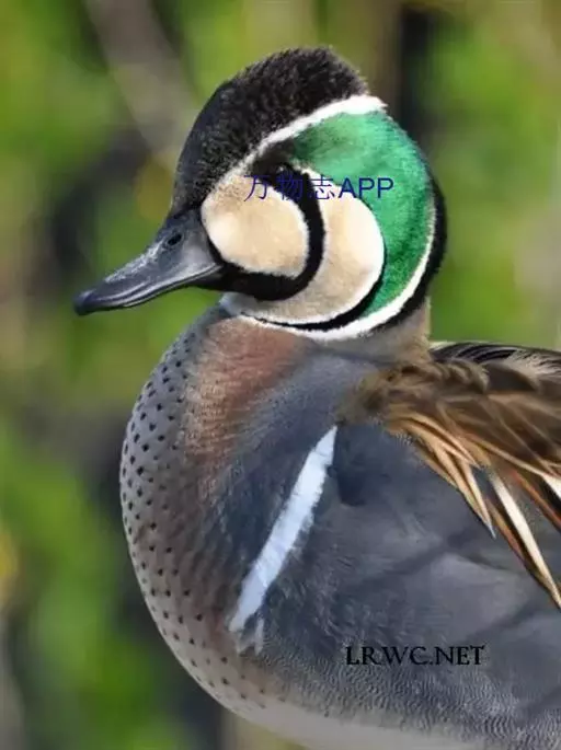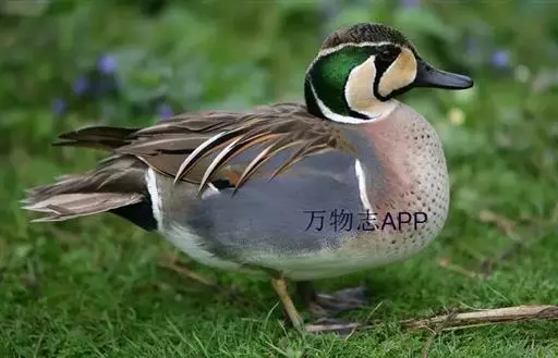 雄鸟繁殖羽头顶至后颈上部黑褐色,具淡棕色羽端。脸部自眼后有一宽阔的翠绿色金属带斑延伸至后颈下部;绿带与头颈部黑褐色之间有一白色狭纹,其余脸部呈乳黄色;在绿色带斑与乳黄色斑之间夹有黑色细线,并向颈侧下方延伸;黑色线与黄色脸斑之间还有白色细线;眼周黑色,并有一黑纹自眼周向下至喉部,从而将脸部乳黄色斑分割为前后两块。上背和两胁蓝灰色,密布以黑褐色波状细纹;下背至尾上覆羽暗褐色,具淡色羽缘;尾上覆羽尤淡,尾羽褐色,具细狭的棕白色羽缘;肩羽长而细,内翈棕白色,外翈绒黑色,具宽的棕红色羽缘。翅上覆羽暗褐色,大覆羽具宽的棕色端斑,形成翼镜前面棕色边缘。翼镜铜绿色,后面转为黑色,再后白色。颏、喉和前颈上部黑褐色,胸淡棕色,满杂以暗褐色点状斑,下胸两侧各具一宽阔的白色横带。腹白色,尾下覆羽黑褐色,中部具棕白色端斑,两侧具暗棕色羽缘,尾下覆羽两侧前面各有一白色宽带。腋羽白色。非繁殖羽似雌鸟。
