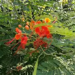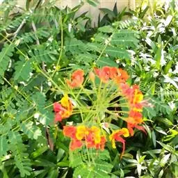 洋金凤 Sw.),豆科小凤花属灌木状或小乔木植物,枝无毛,绿或粉绿色;二回羽状复叶;总状花序伞房状,…