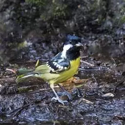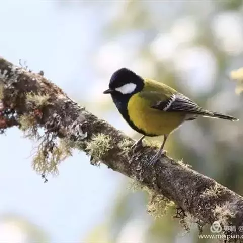 黄颊山雀是雀形目山雀科山雀属鸟类。雄鸟额、头顶和羽冠为具有光泽的黑色;额基、眼先、眉纹、脸颊和耳羽等头颈侧为鲜艳的明黄色;贯眼纹黑色;后颈亦具一黄斑;上体灰黄绿色,羽缘黑色;尾羽黑色具蓝灰色羽缘,基部白色;下体颏、喉至上胸为富有金属光泽的黑色;胸下有一黑色宽中央纵纹,一直延伸至肛周;其余下体白色;胸侧和两胁染黄色或蓝灰色;虹膜暗褐色;喙黑色;脚铅蓝灰色至铅黑色。雌鸟似雄鸟,但上体光泽较弱,胸腹部黑色纵带不明显。黄颊山雀分布于亚洲东南部地区,在中国分布于华中、华南和西南等地。栖息于中低山常绿阔叶林、针叶林和混交林中,也见于山麓疏林灌丛草坡或茶园、果园等地。常成对或小群活动,也和大山雀等其他小型鸟类混群,活跃地在乔灌木枝叶间飞翔跳跃。主食鳞翅目和鞘翅目等昆虫,兼食植物种实。繁殖期在4-6月,营巢于树洞、岩隙或墙缝中。窝卵数为3-7枚,卵灰白色且有红褐斑,雏鸟晚成。黄颊山雀被列入中国林业局200