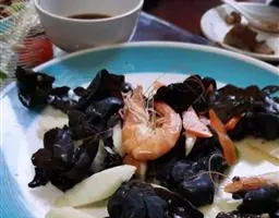 2)、炒锅置中火上,放入油3汤匙烧热,下葱末、姜末炒香,放入茄子块和泡好的海米,约炒2分钟后,加入酱油、盐、糖和泡海米的水炒匀,转用小火焖烧10分钟后即可