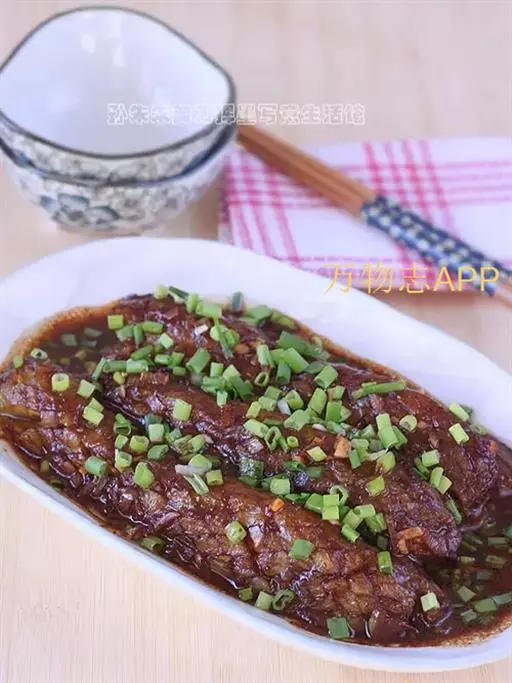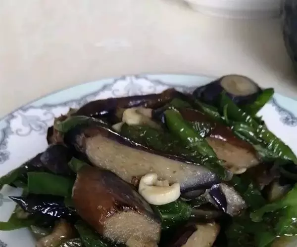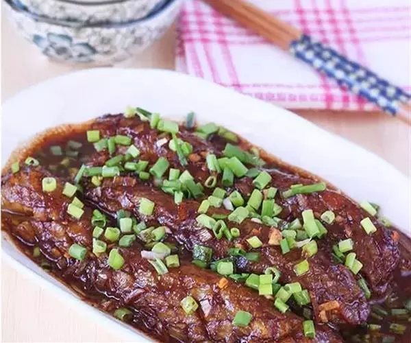 原料: 茄子500克、花生油500克(实耗40克)、酱油25克、味精2克、精盐3克,水淀粉10克、葱、姜蒜各少许。