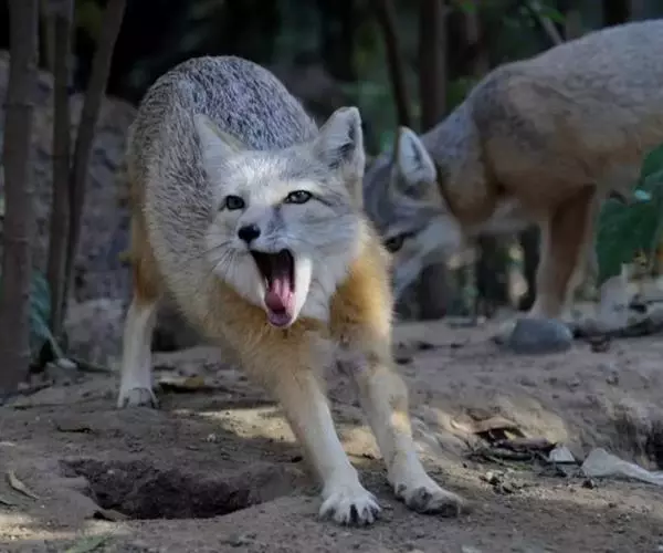 沙狐(学名:Vulpes corsac):体长50-60厘米,尾长25-35厘米,体重约2-3千克。比赤狐略小。是一种长腿,红灰色的狐狸。脸短而吻尖,耳大而尖,耳基宽阔。背部呈浅棕灰色或浅红褐色,底色为银色。下颏至胸腹部呈淡白色至黄色。腹下和四肢内侧为白色,尾基部半段毛色与背部相似,末端半段呈灰黑色。夏季毛色近于淡红色。