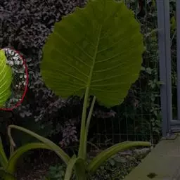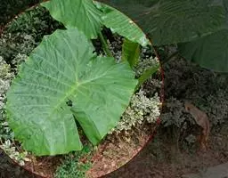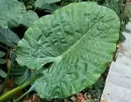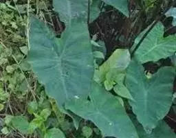 块茎球形、卵球形至长圆形,长2-4厘米,粗1-1.8厘米,表面密生多数须根。叶1,叶柄长12-25厘米,常紫色或绿色具紫斑,几无鞘,下部及顶头各有珠芽1枚。幼株叶片心状长圆形,长4厘米,宽2厘米;多年生植株叶片心形、心状三角形、心状长圆形或心状戟形,表面绿色、暗绿色,背面淡绿色或红紫色,二面沿脉颜色均较淡,先端长渐尖,有时成尾状,基部心形;长6-25厘米,宽2.5-7.5厘米;后裂片圆形或锐尖,稍外展。