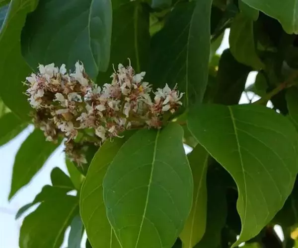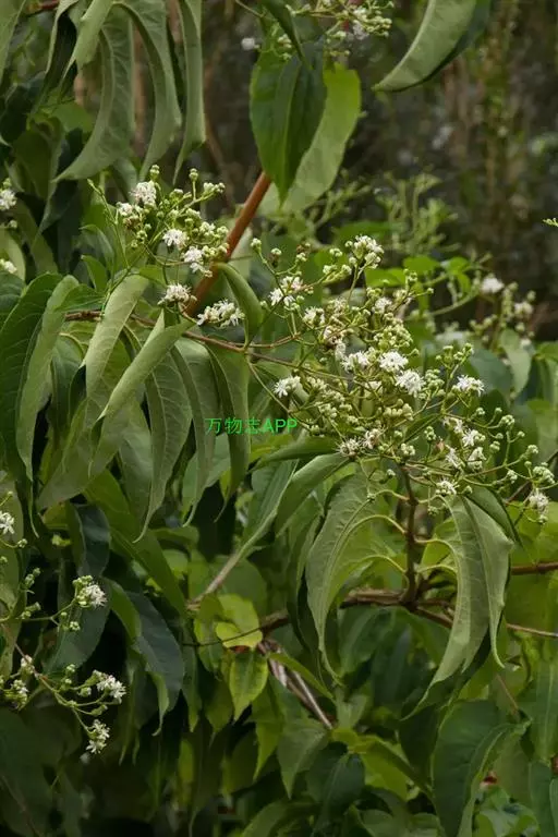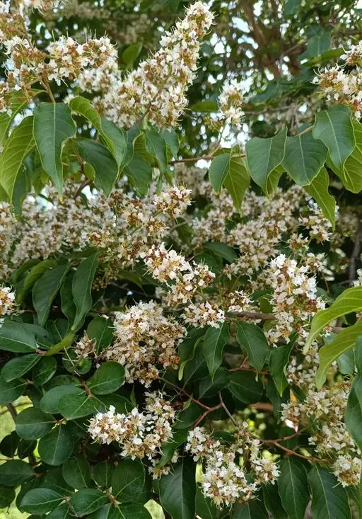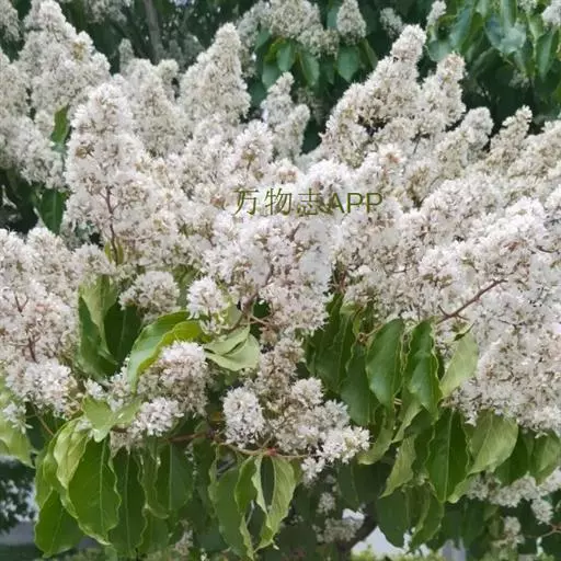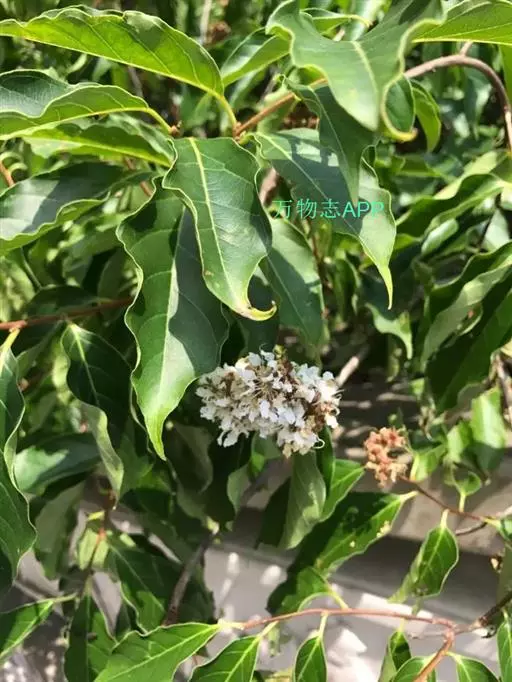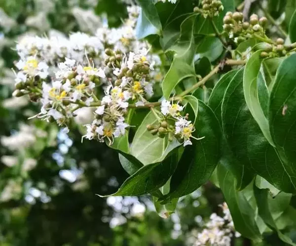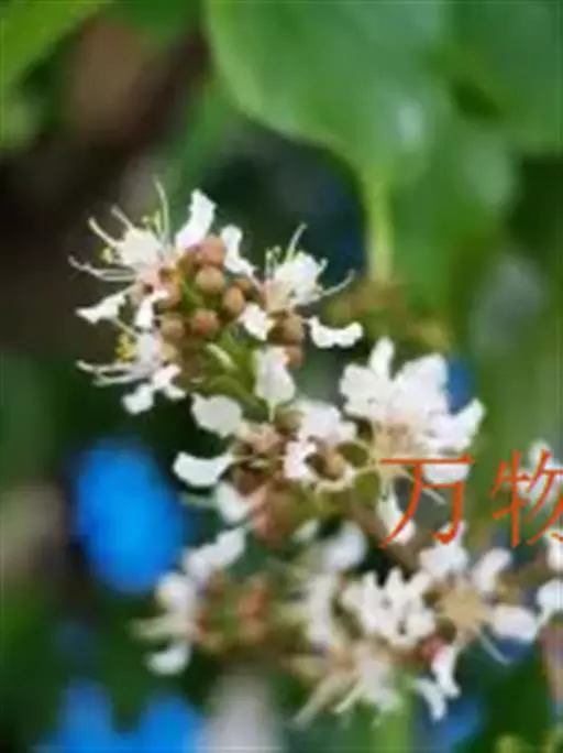 花小,白色或玫瑰色,直径约1厘米,组成顶生圆锥花序,长5-15厘米,具灰褐色微柔毛,花密生;花萼有棱10-12条,长3.5-4.5毫米,5裂,裂片三角形,直立,内面无毛;花瓣6,长2-6毫米,皱缩,有爪;雄蕊15-30,约5-6枚较长,12-14条较短,着生于萼片或花瓣上,花丝细长;子房无毛,5-6室。
