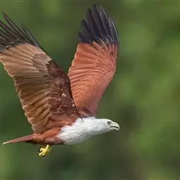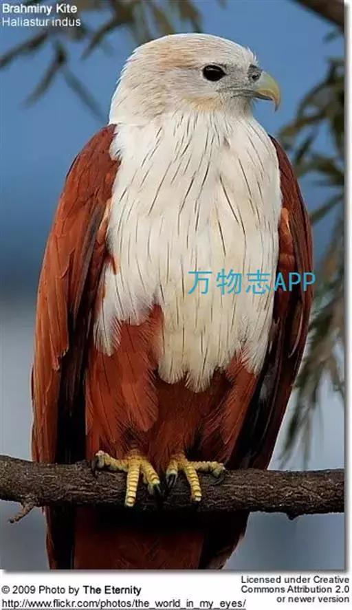 栗鸢(学名:Haliastur indus):又叫红老鹰,为中型猛禽。体长36-51厘米。虹膜为褐色或红褐色,头、颈、胸和上背白色,其余体羽和翅膀均为栗色。主要栖息于江河、湖泊、水塘、沼泽、沿海海岸和邻近的城镇与村庄。除繁殖期成对和成家族群外,通常单独活动。活动在白天。常单独在湖滨、海滨、河岸或水域与村庄上空长时间地翱翔和滑翔。主要以蟹、蛙、鱼等为食,也吃昆虫、虾和爬行类,偶尔也吃小鸟和啮齿类。