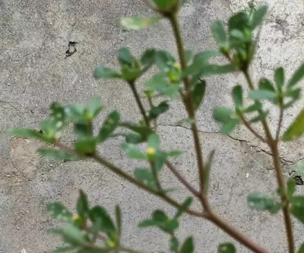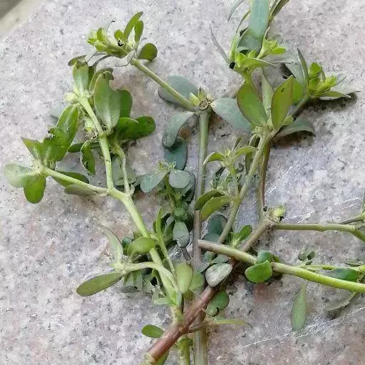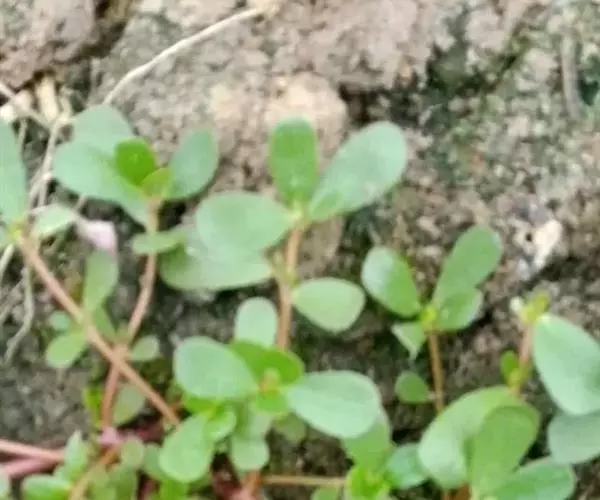 一年生草本,全株无毛。茎平卧或斜倚,伏地铺散,多分枝,圆柱形,长10-15厘米淡绿色或带暗红色。茎紫红色,叶互生,有时近对生,叶片扁平,肥厚,倒卵形,似马齿状,长1-3厘米,宽0.6-1.5厘米,顶端圆钝或平截,有时微凹,基部楔形,全缘,上面暗绿色,下面淡绿色或带暗红色,中脉微隆起;叶柄粗短。