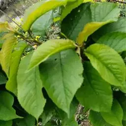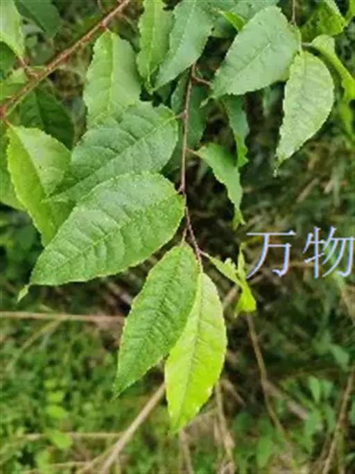 叶片椭圆形或长圆椭圆形,稀倒卵椭圆形,长4-10厘米,宽2.5-5厘米,先端尾状渐尖或短渐尖,基部圆形、宽楔形,偶有楔形,边缘有贴生锐锯齿,上面深绿色,下面淡绿色,两面无毛;叶柄长1-1.5厘米,通常无毛,无腺体,有时在叶片基部边缘两侧各有1个腺体;托叶膜质,线形,先端渐尖,边有腺齿,早落。