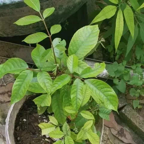 乔木,高达20米,胸径达45厘米。小枝粗10毫米,干时紫褐色,髓部周围及中央有柱状维管束。无托叶。小叶4-6对,纸质至革质,无毛,宽椭圆形、卵形或圆形,稀长圆形,长6-17厘米,宽2-7.5厘米,顶端急渐尖,尖头短而钝;基部圆形或阔楔形,偏斜,全缘;侧脉(8-)11(-15)对,网脉明显。花序腋生,为疏散的聚伞圆锥花序(稀近总状花序),无毛;雄花序多花,雌花序少花。