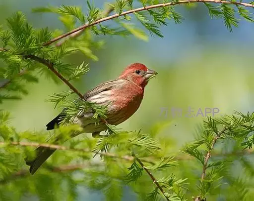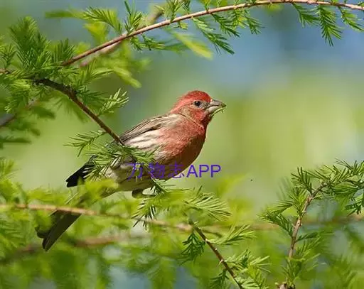 长尾朱雀:体长18厘米,体重16-26克。雄鸟额、颏和眼后为暗红色,…