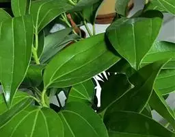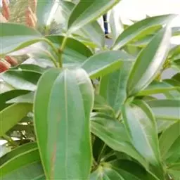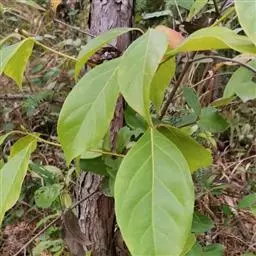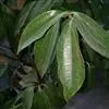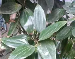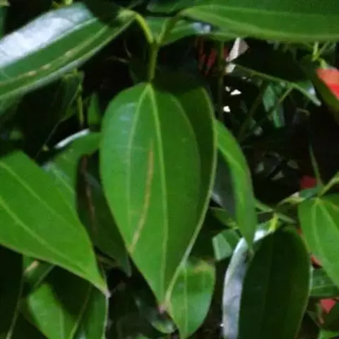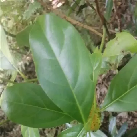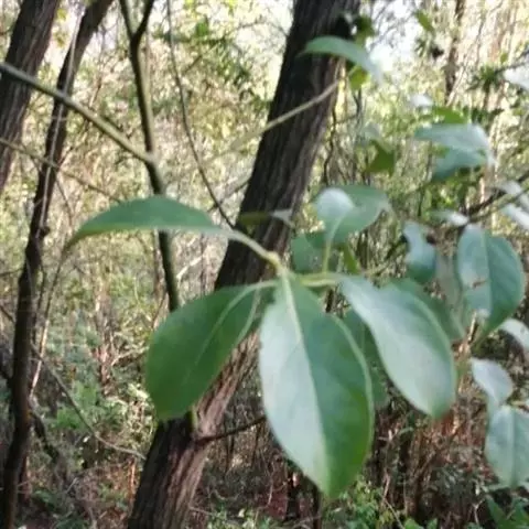 叶互生,通常为椭圆状卵形或长椭圆状卵形,长6-12厘米,宽3-6厘米,在花枝上的稍小,先端通常急尖或短渐尖,基部楔形或阔楔形,革质,上面深绿色,下面色稍浅,两面无毛或仅下面腺窝具毛簇,羽状脉,侧脉每边4-5条,与中脉两面明显,侧脉脉腋上面不明显凸起下面无明显的腺 窝,细脉和小脉网状;叶柄长1.5-3厘米,腹凹背凸,无毛。