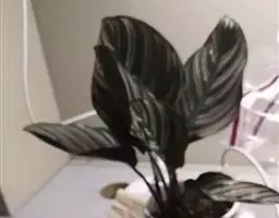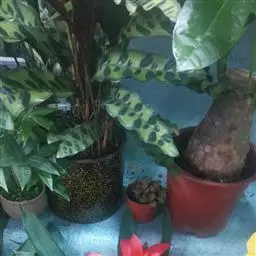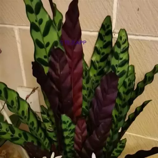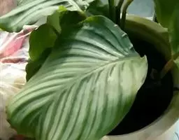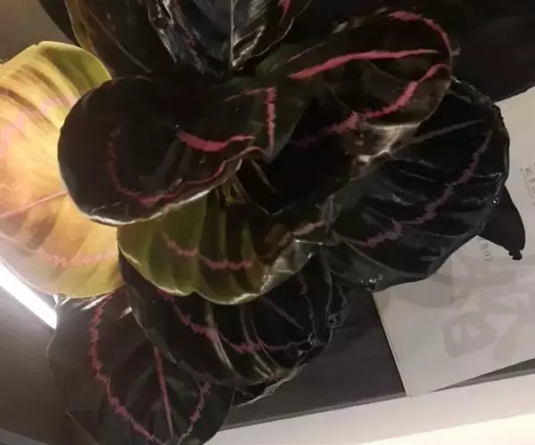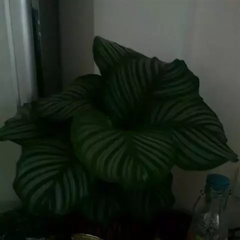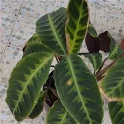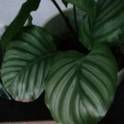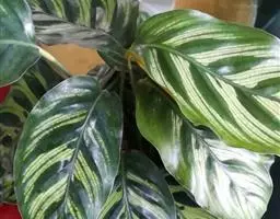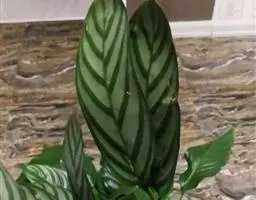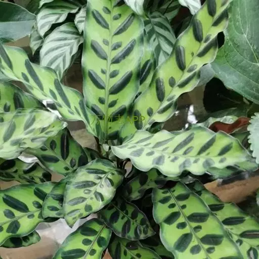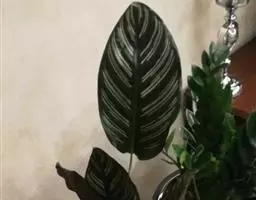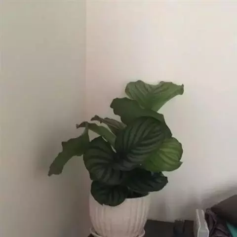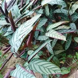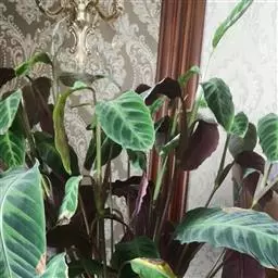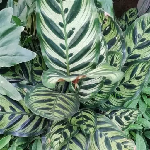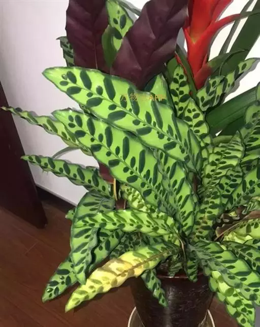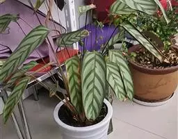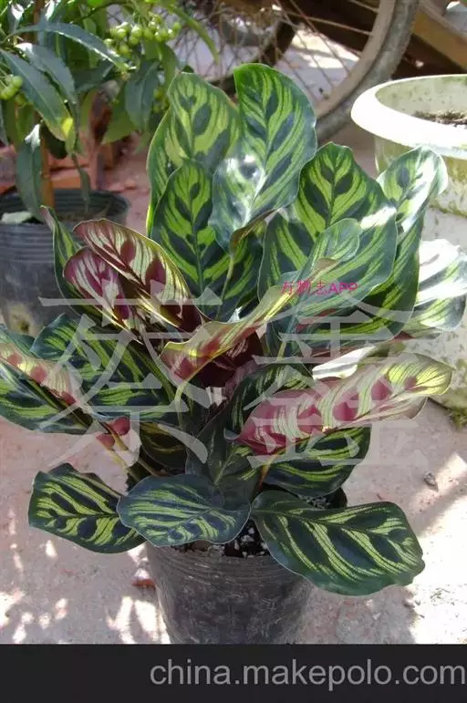 孔雀竹芋(学名:Calathea makoyana E. Morr.):竹芋科,肖竹芋属多年生常绿草本。植株挺拔株高可达60厘米。叶柄紫红色, 叶片薄革质,卵状椭圆形,叶面上有墨绿与白色或淡黄相间的羽状斑纹,就像孔雀尾羽毛上的图案,因而得名。叶片亦有特性:白天舒展,晚间折叠起来。