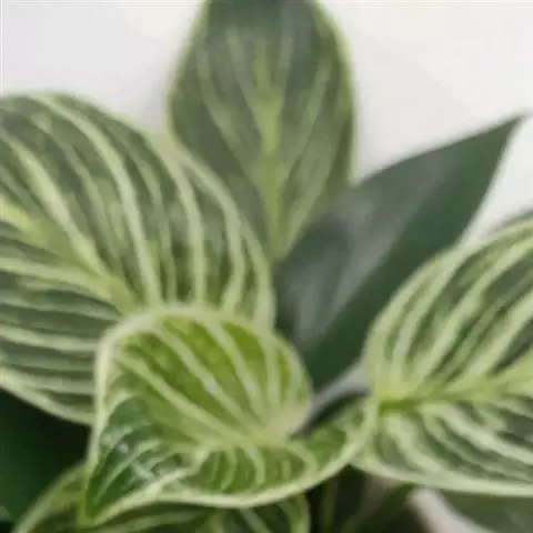 孔雀竹芋植株密集丛生挺拔株高20-60厘米。叶柄紫红色, 从根状茎长出,叶片薄革质,卵状椭圆形,长10-20厘米,宽5-10厘米黄绿色,在叶的表面绿色上隐约呈现着一种金属光泽,且明亮艳丽,主脉两侧交互排列,羽状暗绿色长椭形的绒状斑纹,与斑纹相对的叫背面为紫色,左右交互排列。 叶片有 “睡眠运动 , 即在夜间叶片从叶鞘部向上延至叶片,昱抱茎折叠,翌晨阳光照射后重新展。
