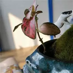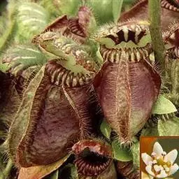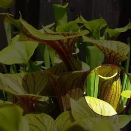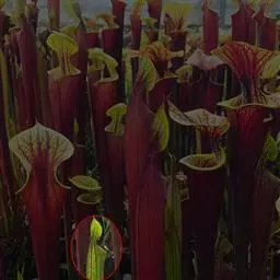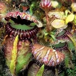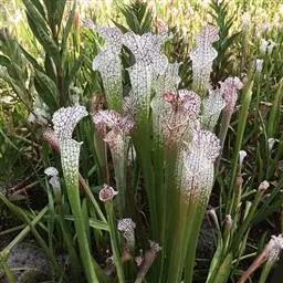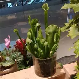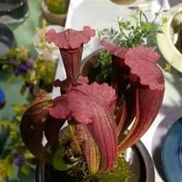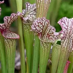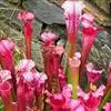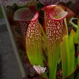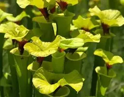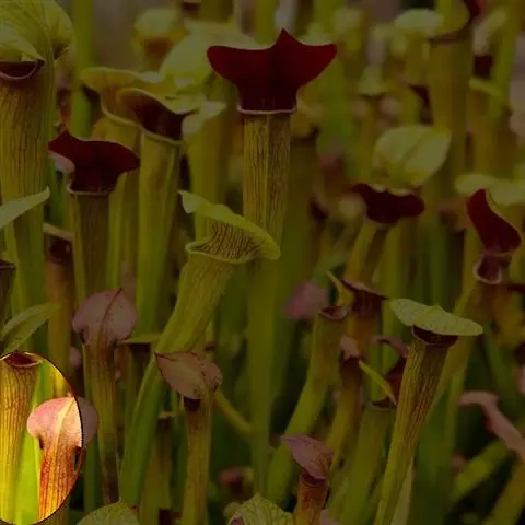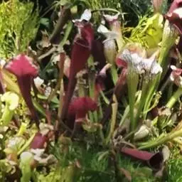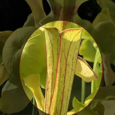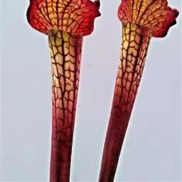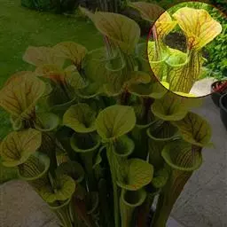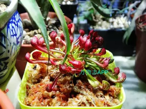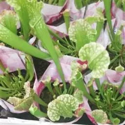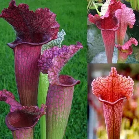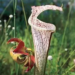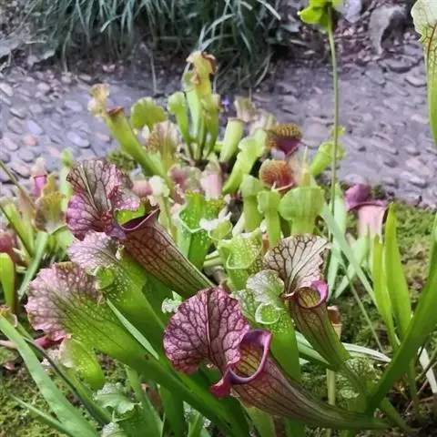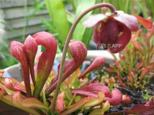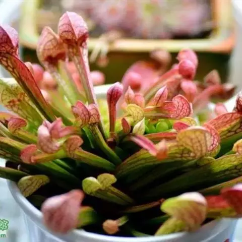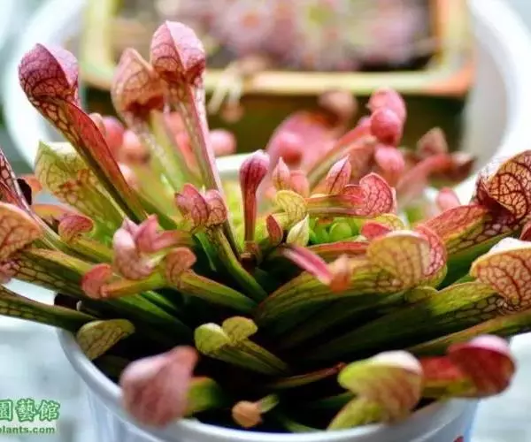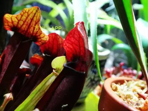 瓶子草是一种相对体形较大气质高雅的食虫植物,叶子成瓶状直立或侧卧,颜色 鹦鹉瓶子草 鲜艳,有绚丽的斑点或网纹,形态和猪笼草的笼子相似,能分泌蜜汁和消化液,受蜜汁引诱的昆虫失足掉落瓶中,瓶内的消化液会把昆虫消化吸收。