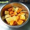 3、将椰汁、鲜奶各一半份量,混合盛入木瓜中,加入冰糖碎,盖实,放上深碟,隔水炖到汁料滚热、木瓜熟,即可供食。