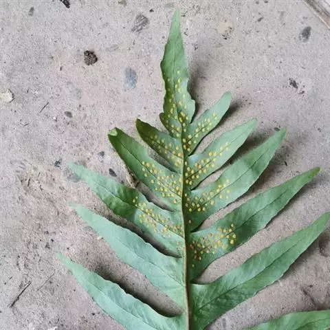 孢子囊散生于主裂片第一次分叉的凹缺处以下,不到基部,初时绿色,后变黄色;隔丝灰白色,星状毛。孢子绿色。