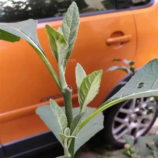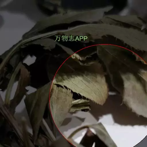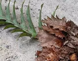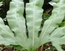 正常能育叶常成对生长,下垂,灰绿色,长25-70厘米。分裂成不等大的3枚主裂片,基部楔形,下延,近无柄,内侧裂片最大,多次分叉成狭裂片,中裂片较小,两者都能育,外侧裂片最小,不育,裂片全缘,通体被灰白色星状毛,叶脉粗而突出。