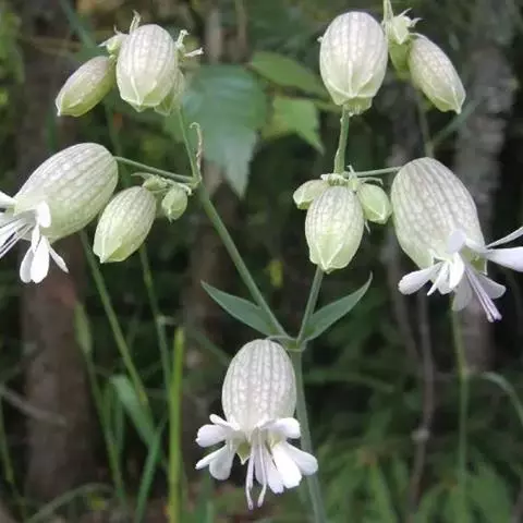 白玉草 多年生草本,高40-100厘米,全株无毛,呈灰绿色。根微粗壮,木质。茎疏丛生,直立,上部分枝,常灰白色。叶片卵状披针形、披针形或卵形,长4-10厘米,宽1-3 (-4.5) 厘米,下部茎生叶片基部渐狭成柄状,顶端渐尖或急尖,边缘有时具不明显的细齿,中脉明显,上部茎生叶片基部楔形、截形或圆形,微抱茎。二歧聚伞花序大型;花微俯垂;花梗比花萼短或近等长;苞片卵状披针形,草质;花萼宽卵形,呈囊状,长13-16毫米,直径5-7毫米,近膜质,常显紫堇色,萼齿短,宽三角形,顶端急尖,边缘具缘毛;雌雄蕊柄无毛,长约2毫米;花瓣白色,长15-18毫米,爪楔状倒披针形,无毛,耳卵形,