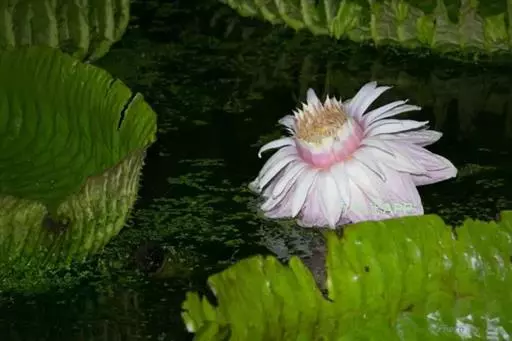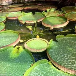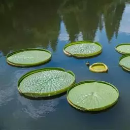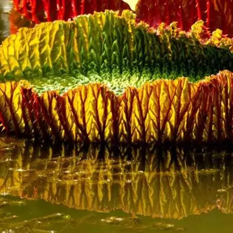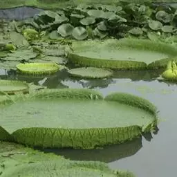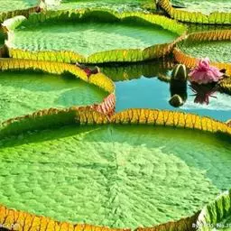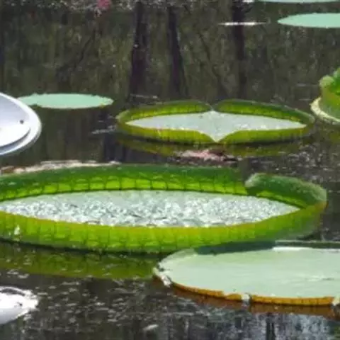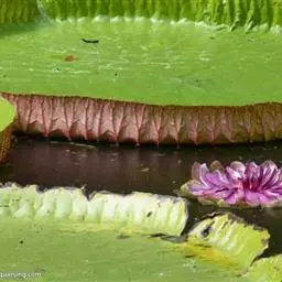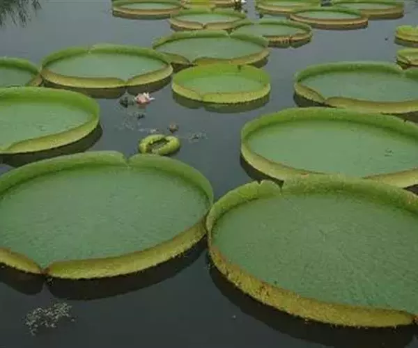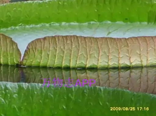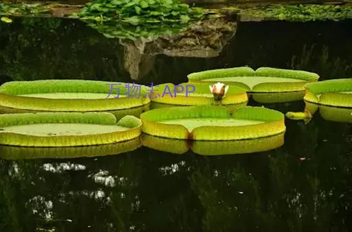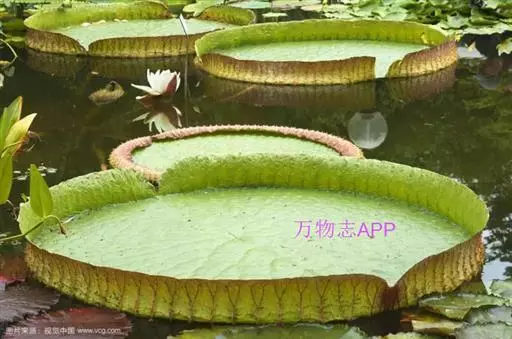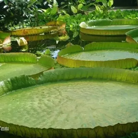属睡莲科多年生或一年生大型浮叶草本。有直立的根状短茎和发达的不定须根,白色。果实成熟时,内含五六百粒种子,大小形状似豌豆,含有丰富淀粉,可食用,南美洲人因此称之为“水玉米”。王莲是水生有花植物中叶片最大的植物,其初生叶呈针状,长到2~3片叶呈矛状,至4~5片叶时呈戟形,长出6~10片叶时呈椭圆形至圆形,到11片叶后叶缘上翘呈盘状,叶缘直立,叶片圆形,像圆盘浮在水面,直径可达2米以上,叶面光滑,绿色略带微红,有皱褶,背面紫红色,叶柄绿色,长2~4m,叶子背面和叶柄有许多坚硬的剌,叶脉为放射网状。