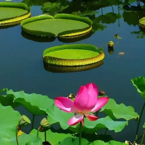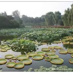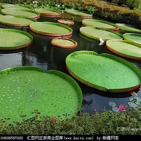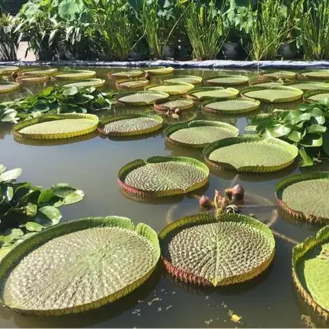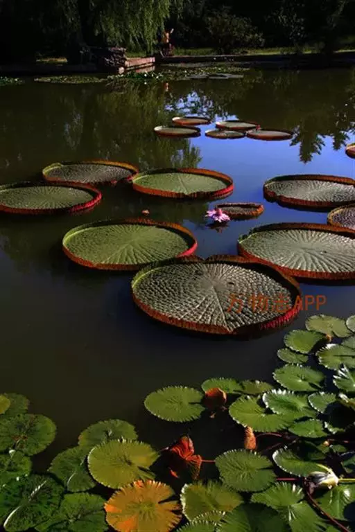 王莲是水景园中的瑰宝,口十片为圆形,叶片边缘向上卷曲,整个叶面浮于水面,十分奇特。王莲的单花花期仅三天,每天的颜色还不相同,开花时花蕾伸出水面,第一天开白色并伴有芳香,第二天变为粉红色,第三天则变为紫红色,然后闭合沉入水中,种子在水中成熟。 王莲主要有‘克鲁兹’王莲和‘亚马逊’王莲2个栽培种,‘克鲁兹’王莲的耐寒性、抗逆性较‘亚马逊’王莲强,栽培也较为容易,北方地区多引种 和栽培此种。‘克鲁兹’王莲叶片直径1.5m~1.8m,边缘直立可达10cm~15cm,叶背叶脉呈深红色,一般于8月中旬至9月开花。