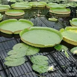 王莲是水景园中的瑰宝,口十片为圆形,叶片边缘向上卷曲,整个叶面浮于水面,十分奇特。王莲的单花花期仅三天,每天的颜色还不相同,开花时花蕾伸出水面,第一天开白色并伴有芳香,第二天变为粉红色,第三天则变为紫红色,然后闭合沉入水中,种子在水中成熟。   王莲主要有‘克鲁兹’王莲和‘亚马逊’王莲2个栽培种,‘克鲁兹’王莲的耐寒性、抗逆性较‘亚马逊’王莲强,栽培也较为容易,北方地区多引种 和栽培此种。‘克鲁兹’王莲叶片直径1.5m~1.8m,边缘直立可达10cm~15cm,叶背叶脉呈深红色,一般于8月中旬至9月开花。
