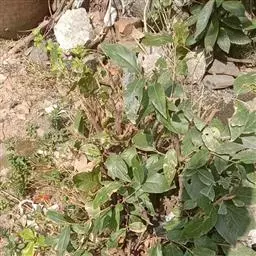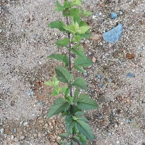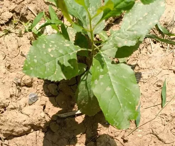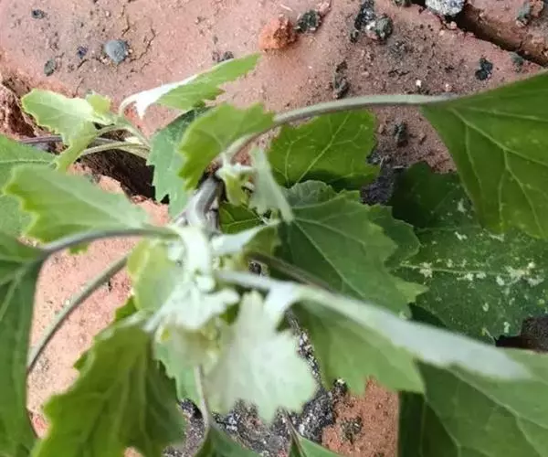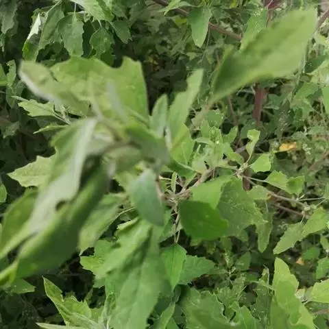 全草黄绿色。茎具条棱。叶片皱缩破碎,完整者展平,呈菱状卵形至宽披针形,叶上表面黄绿色,下表面灰黄绿色,被粉粒,边缘具不整齐锯齿;叶柄长约3cm。圆锥花序腋生或顶生。