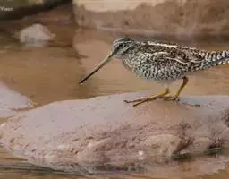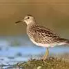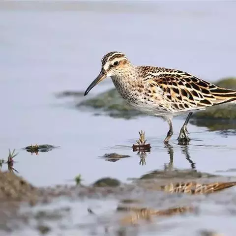 阔嘴鹬是涉禽,体长17厘米。特征为翼角常具明显的黑色块斑并具双眉纹。与黑腹滨鹬平滑下弯的嘴相比,…