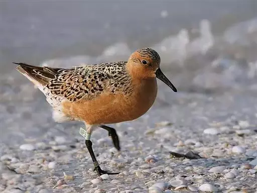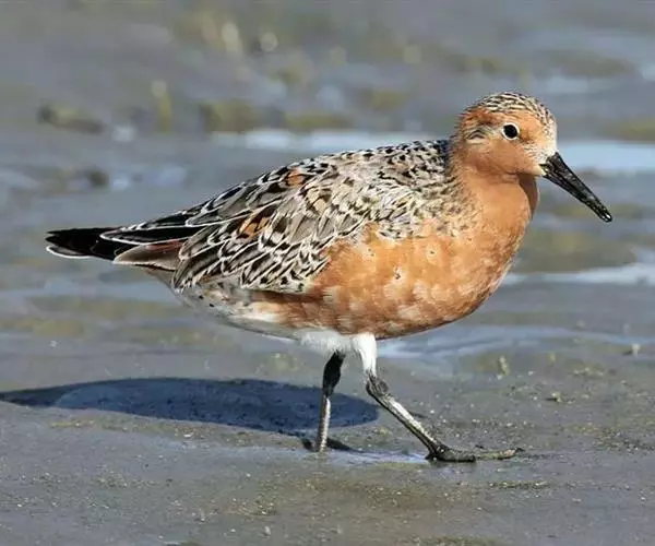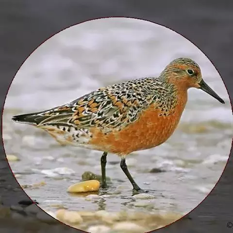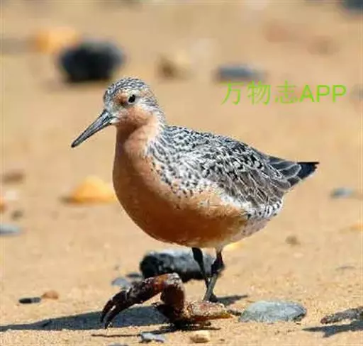 红腹滨鹬(学名:Calidris canutus),是鹬科、滨鹬属的小型涉禽,体长23-25厘米,嘴较短而直、黑色,脚亦甚短、绿色。体较粗胖。夏季上体灰褐色具黑色中央纹,背具棕栗色和白色斑纹和羽缘,头侧和整个下体栗红色。冬季棕红色消失,上体灰色,头具细窄的黑色纵纹,背具细的黑色羽干纹和白色羽缘。下体白色,颊至胸具灰褐色纵纹。