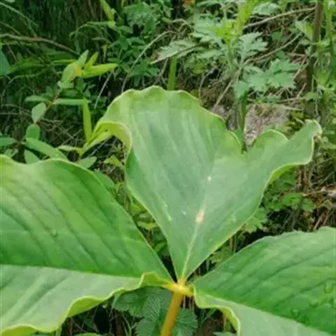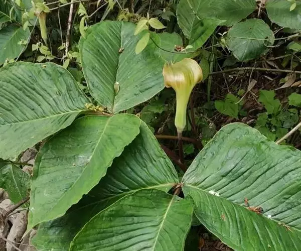 块茎近球形,直径1-4厘米。鳞叶膜质,线状披针形,最上的长12-15厘米,先端锐尖或钝,叶1或2,叶柄长17-35厘米,下部1/2-2/3具鞘,黄绿色,有紫色斑块,形如花蛇;叶片3全裂,中裂片具1.5-5厘米长的柄,长圆形或椭圆形,基部狭楔形或钝,长8-22厘米,宽4-10厘米;侧裂片无柄,极不对称,长圆形,外侧宽为内侧的2倍,下部1/3具宽耳,长5-23厘米,宽2-8厘米;均渐尖或骤狭渐尖、锐尖;侧脉脉距约1厘米,集合脉距边缘5毫米。