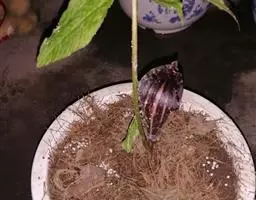 花序柄与叶柄近等长,常较短。佛焰苞外面淡紫色,管部漏斗状,长4-7厘米,上部粗1-2.5厘米,喉部无耳,斜截形,略外卷或否,骤狭为檐部;檐部披针形,狭渐尖,长4-7厘米,有时具长2-3厘米的尾尖,宽2.5-3厘米,深紫色或绿色,下弯或垂立。肉穗花序单性,雄花序长1.5-2.5厘米,花疏;雌花序圆柱形或近球形,长1-2厘米;各附属器具长6毫米的细柄(粗约1毫米),基部截形,粗4-6毫米,向中部稍收缩,向上又增粗为棒状,先端钝圆,长4-5厘米,直立。