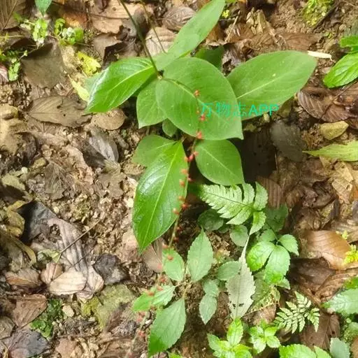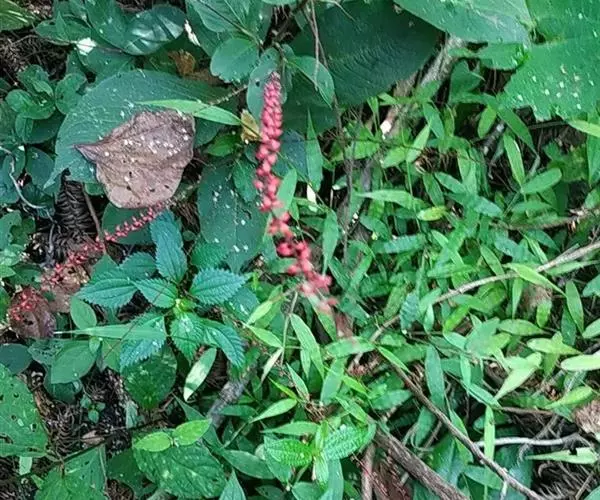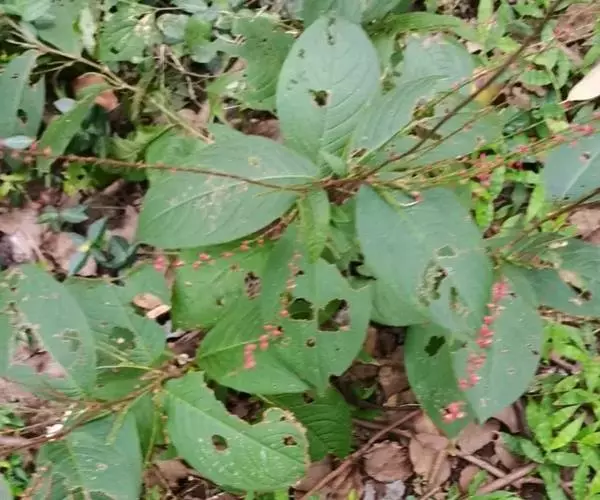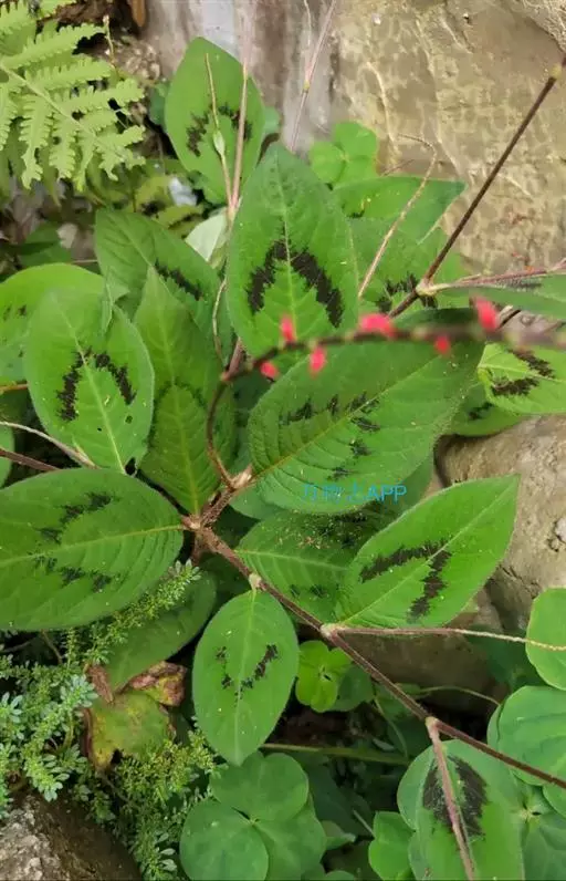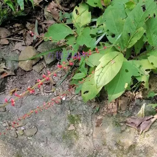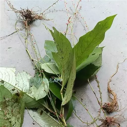 金线草:多年生直立草本,高50-100cm。根茎横走,粗壮,扭曲。茎节膨大。叶互生;有短柄;托叶鞘筒状,抱茎,膜质;叶片椭圆形或长圆形,长6-15cm,宽3-6cm,先端短渐尖或急尖,基部楔形,全缘,两面有长糙伏毛,散布棕色斑点。穗状花序顶生或腋生;花小,红色;苞片有睫毛;花被4裂;雄蕊5;柱头2歧,先端钩状。瘦果卵圆形,棕色,表面光滑。花期秋季,果期冬季。
