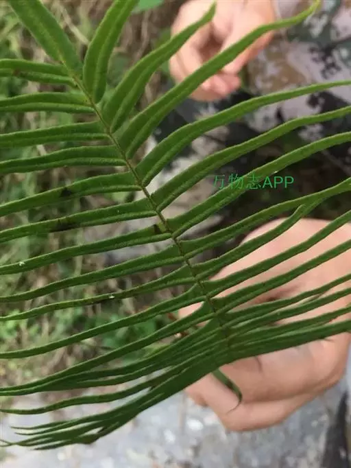 植株高50-70厘米。根状茎短而直立或斜升,粗约1厘米,先端被黑褐色鳞片。叶簇生,二型或近二型;柄长30-45厘米(不育叶的柄较短),基部粗约2毫米,禾秆色,有时带棕色,偶为栗色,表面平滑;叶片卵圆形,长25-30厘米,宽15-20厘米,一回羽状;不育叶的羽片(2)3-5对,10-18(24)厘米,宽1-1.5(2)厘米,先端渐尖,基部阔楔形,叶缘有软骨质的边并有锯齿,锯齿往往粗而尖,也有时具细锯齿;能育叶的羽片3-5(8)对,对生或向上渐为互生,斜向上,基部一对有短柄并为二叉,偶有三叉或单一,向上的无柄,线形(或第二对也往往二叉),长12-25厘米,宽5-12毫米,先端渐尖并有锐锯齿,基部阔楔形,顶生三叉羽片的基部不下延或下延。主脉下面强度隆起,禾秆色,光滑;侧脉两面均明显,稀疏,斜展,单一或从基部分叉。叶干后纸质,绿色或灰绿色,无毛;叶轴禾秆色,表面平滑。