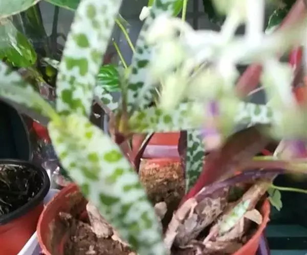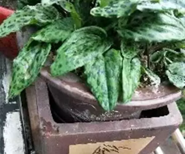 油点百合属于百合科的多年生草本植物,别称是豹纹红宝。原产于南非。株高约10-15公分,紫红色的茎肥大呈酒瓶状,茎顶着生3-5片肉质叶子,叶银绿色并具有不规则的斑点,叶背紫红色。花期春夏季,圆锥花序,小花绿色,约0.3公分,花瓣6枚,基部聚合呈钟型,雄蕊为紫红色。栽培需要有充足的光照。