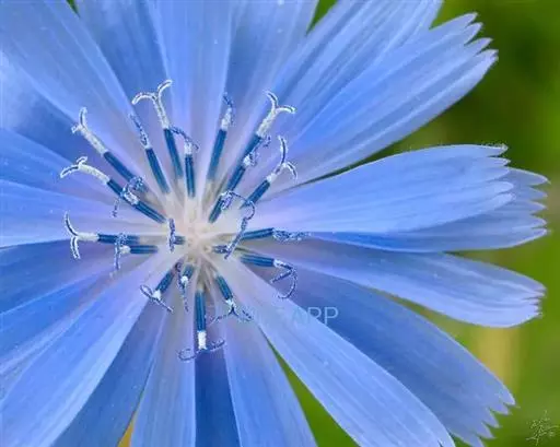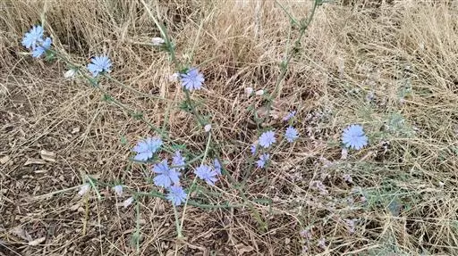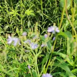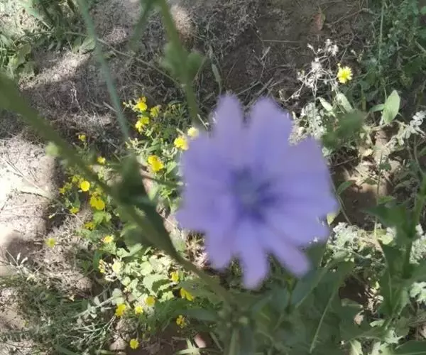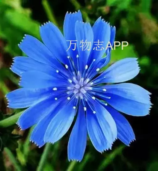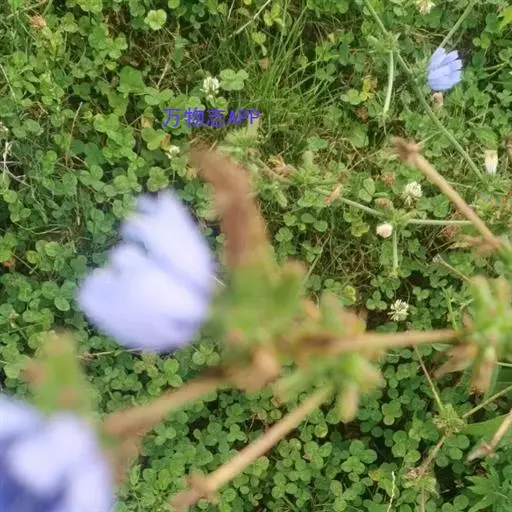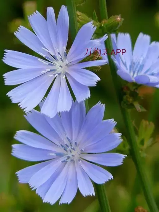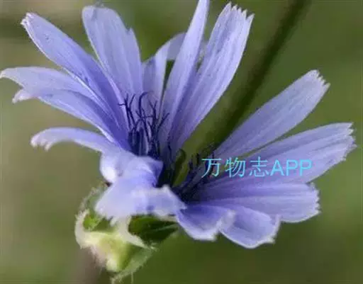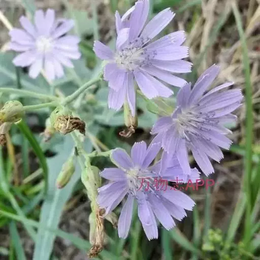 3、菊苣:茎表面近光滑。茎生叶少,长圆状披针形。头状花序少数,簇生;苞片外短内长,无毛或先端被稀毛。瘦果鳞片状,冠毛短,长0.2~0.3mm。