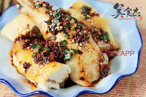 肉色洁白皮带黄油,具有葱油香味,葱段打花镶边,食时佐以酱油或特制普宁豆酱,保持了鸡肉的鲜美、原汁原味,食之别有风味。